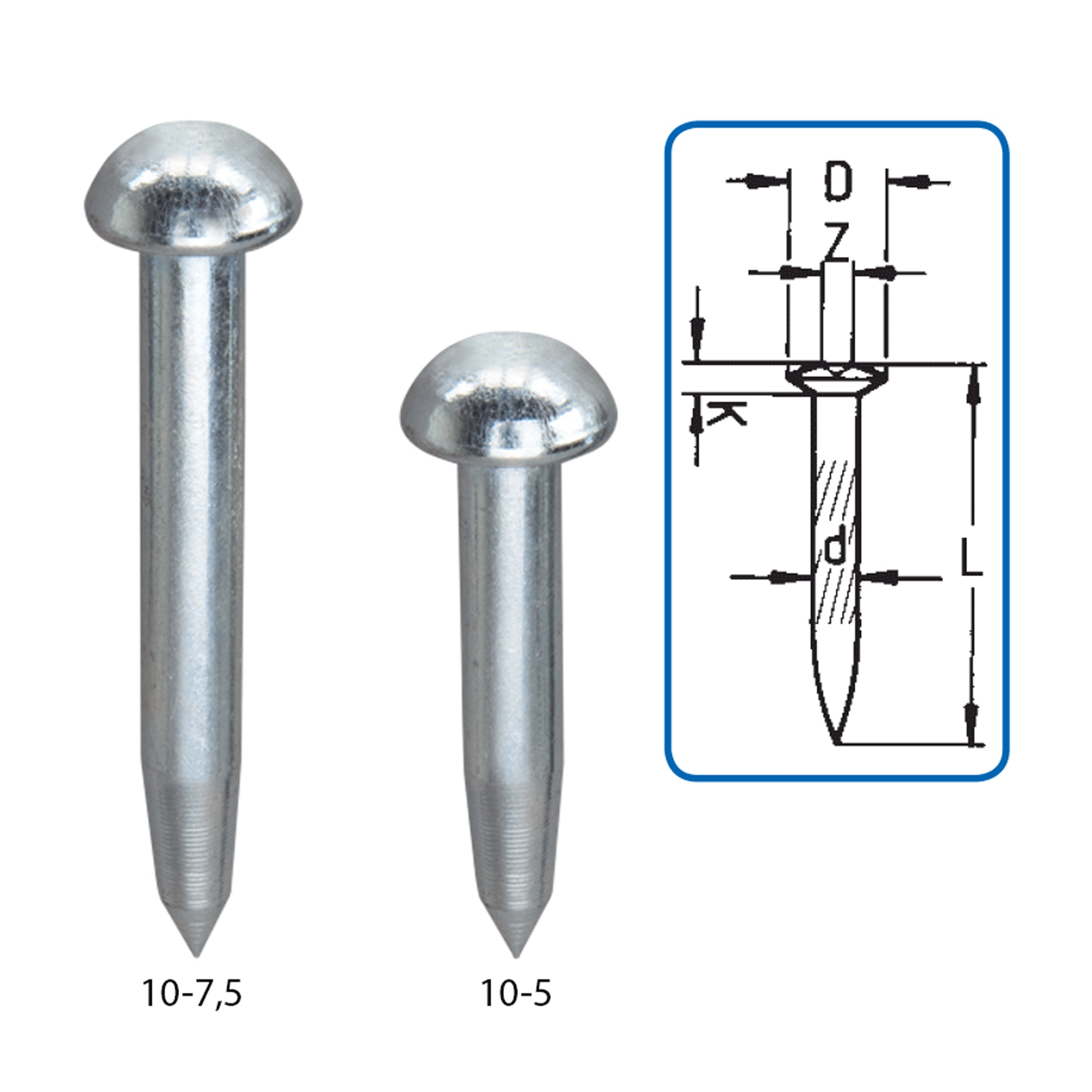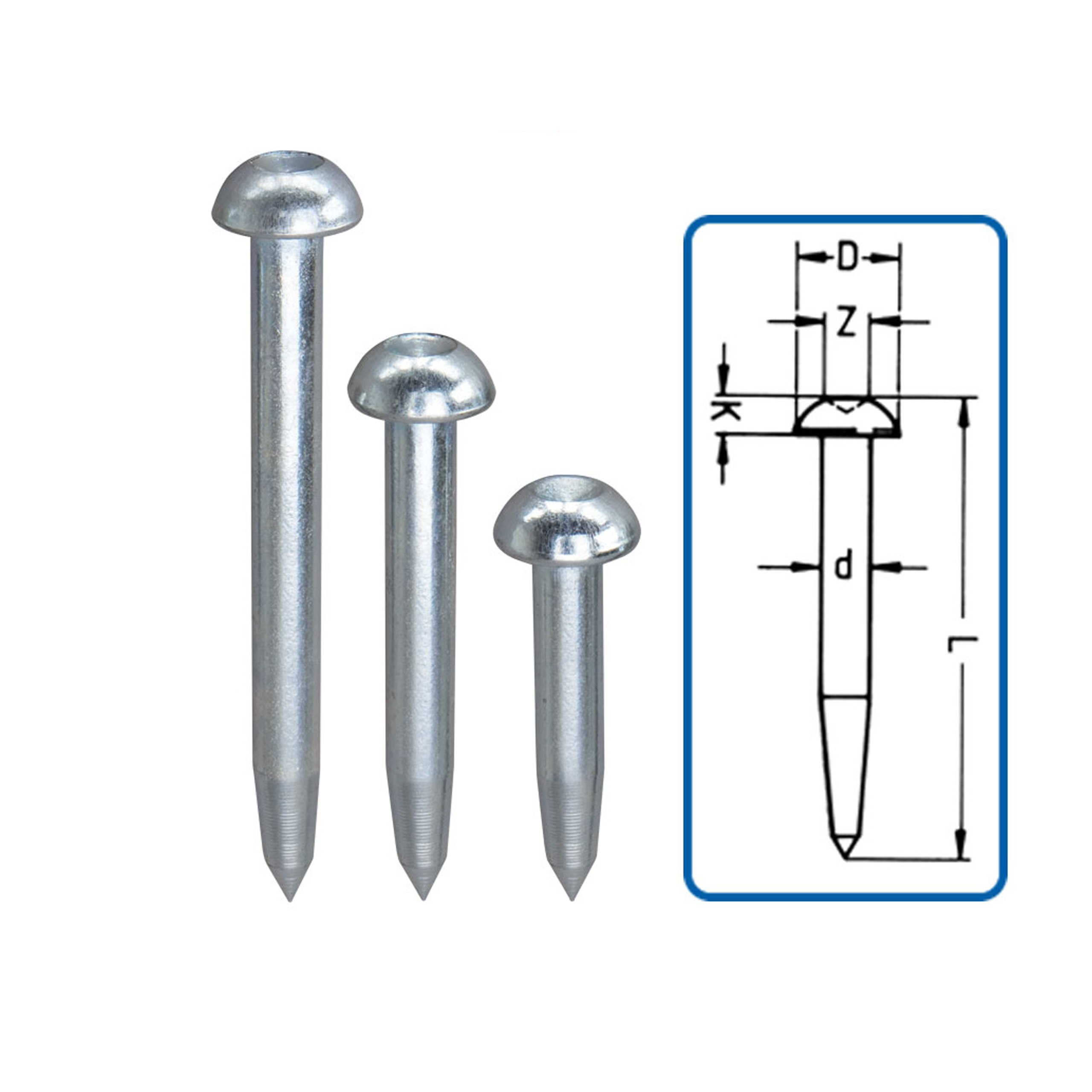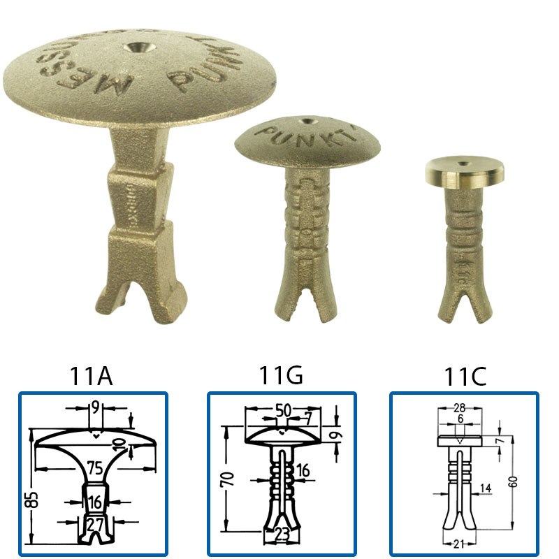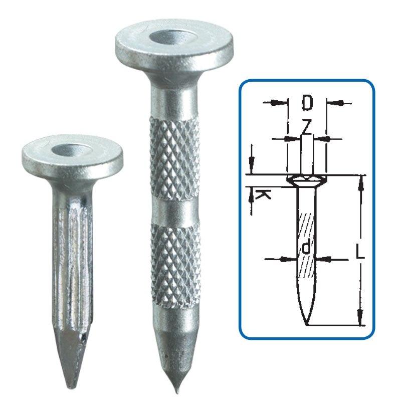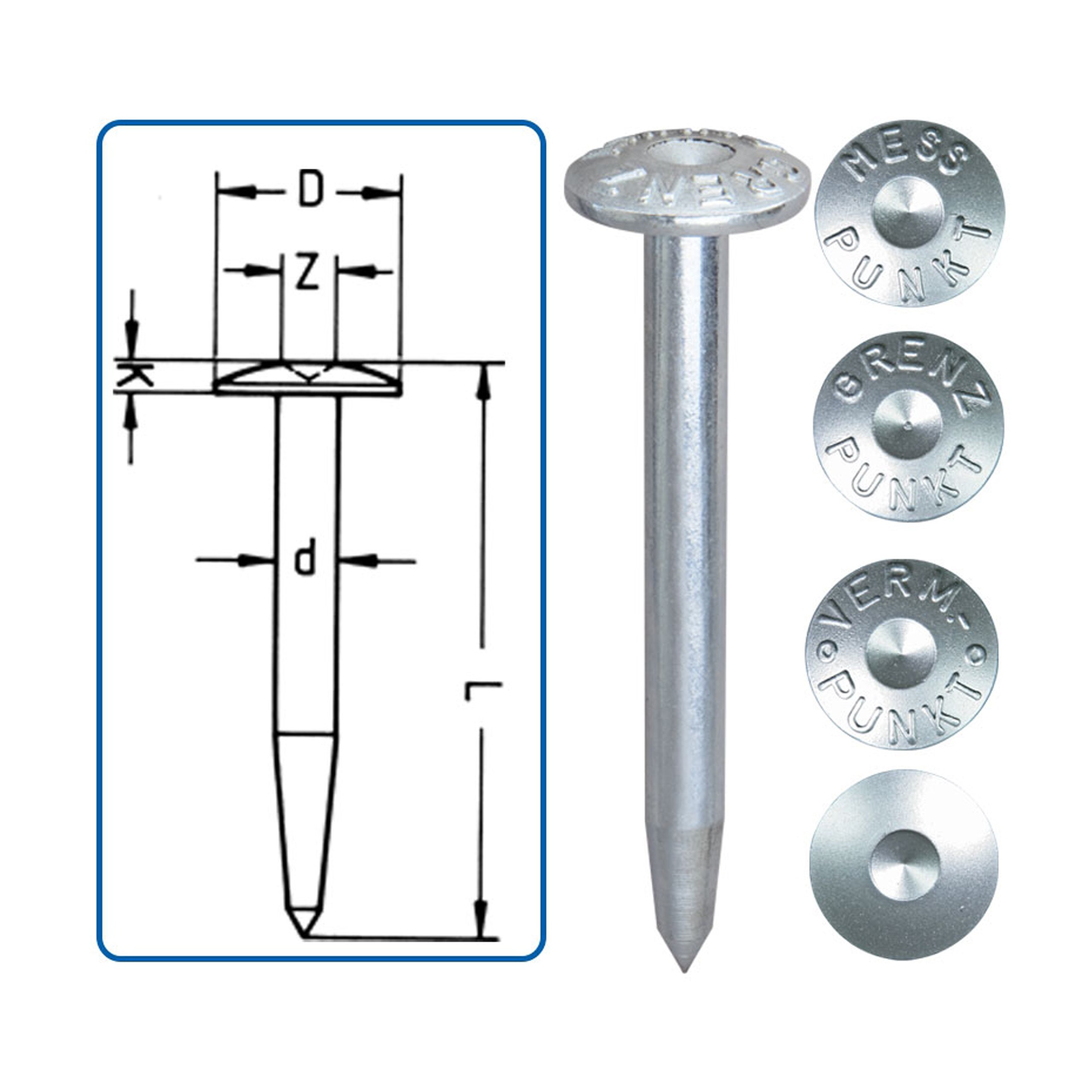 Są to gwoździe wykonane z utwardzanej stali zabezpieczonej przed korozją cynkiem. Karbowanie zapewnia lepsze trzymanie się wbitego gwoździa. Na płaskiej główce mamy centr pozwalający na dokładne ustawienie instrumentu nad punktem.