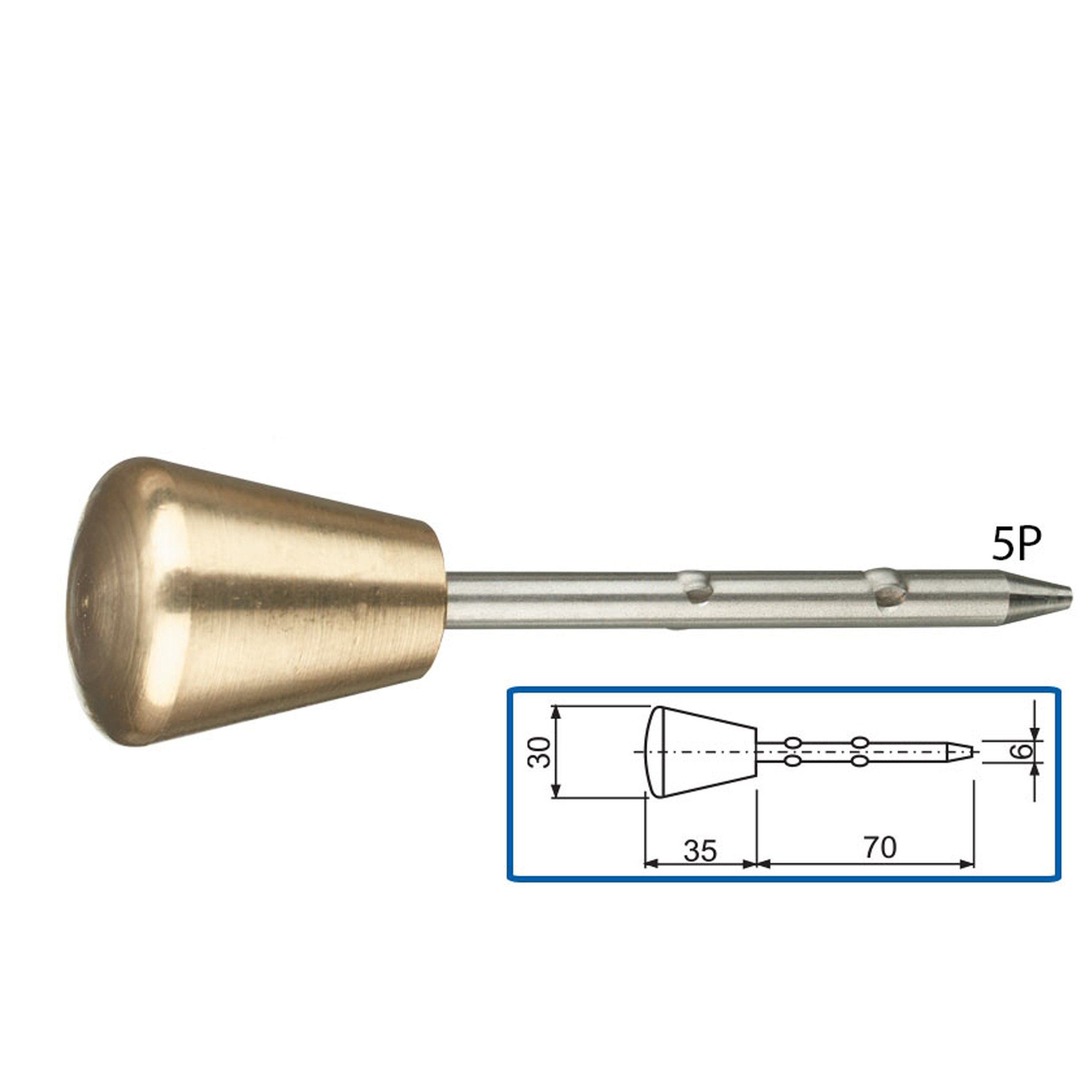 Ten model wykonany również z hartowanej na zimno stali przez co jest bardzo mocny i możemy go wbić w najtwardsze podłoża. Oprócz tego ocynkowana stal jest odporna na negatywne działanie korozji. Na bardzo wypukłej główce znajdziemy centr ułatwiający ustawienie instrumentu nad punktem.